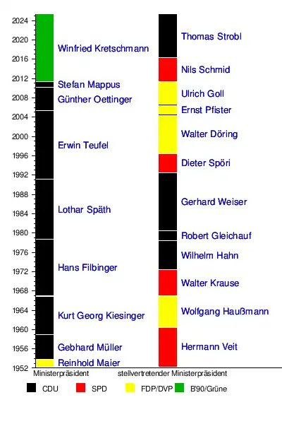 Der erste baden-württembergische Ministerpräsident stammte aus der FDP, dann folgte 58 Jahre lang, von 1953 bis 2011, eine ununterbrochene Reihe von der CDU gestellter Ministerpräsidenten, die 2011 durch den ersten Bündnis-Grünen beendet wurde: