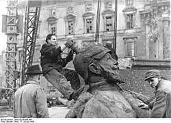 Die DDR-Staatsführung begann bereits unmittelbar nach Ende des Zweiten Weltkriegs mit der bewussten Entfernung und Zerstörung zahlreicher Gebäude und Denkmäler, die als zumindest wiederaufbaubar galten, allerdings als unvereinbar mit der Staatsideologie erachtet wurden. Dieses betraf insbesondere Schlösser, Kirchen, aber auch Reiterstandbilder und Skulpturen. Oft wurde den Objekten eine Verbindung zu Militarismus oder Imperialismus nachgesagt. Bau- oder kulturhistorische Werte wurden dabei missachtet. So wurde im September 1950 das Berliner Schloss auf Geheiß des Zentralkomitees der DDR als Symbol des Ancien Régime und des Militarismus trotz reger Proteste gesprengt.[8] Auch das Kaiser-Wilhelm-Nationaldenkmal, das den Krieg ohne Schäden überstanden hatte, wurde zur selben Zeit als Relikt des Deutschen Kaiserreichs vollständig abgetragen. Zahlreiche weitere monarchistische Reiterstandbilder sollten folgen.