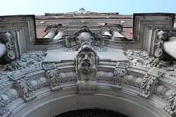 Von der „reichen Dekoration im Neurenaissancestil“[5] haben sich nur das Portal zur Stresemannstraße und der hohe Giebel darüber erhalten. Die vier Figuren[6] über dem Portal sind verloren gegangen. Es fehlen heute auch die beiden kleinen Ecktürme zur Händelstraße und ein Turm auf dem früher viel höheren Mansarddach.[7]