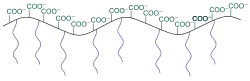 Bei den Polycarboxylatethern (PCE) handelt es sich um organische Polymere, die gängige Fließmittel bzw. Betonverflüssiger sind.[1] Die Wirkung der PCE auf die Festigkeit von Beton lässt sich auf chemischer Ebene erklären. Die Hauptkette der PCE besitzt zum Anlagern an die Zementpartikel negative Ladungen, während die Seitenketten in die Zementleimlösung hineinragen.
