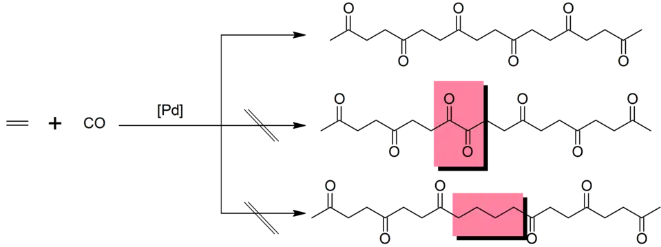 Die Aktivierungsbarriere für die Bildung von Doppelcarbonyl-Insertionen ist sehr hoch, so dass sie nicht auftreten. Die mechanistischen Studien von Brookhart zeigen, dass die Konzentration des Alkyl-Ethylen-Palladium-Komplexes, die erforderlich ist, um doppelte Ethylen-Insertionen zu erzeugen, an jedem beliebigen Punkt sehr niedrig ist: