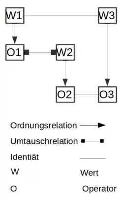 - Die Umtauschrelation befindet sich zwischen den Kontexten (s. Tabelle 1, wo sich die beiden Kontexte in Zeile 5 berühren) und ist eine neue, transklassische Operation zwischen Wertbesetzung (Relatum) und Operator (Relator) selbst.[14]