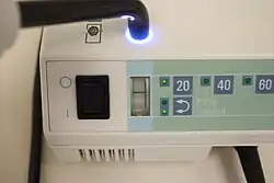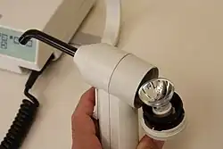 Geräte neueren Typs sind oft mit LEDs als Leuchtquelle ausgestattet. LEDs wurden zum ersten Mal im Jahr 1995 zur Photopolymerisation von Dentalkompositen in der Literatur vorgeschlagen.[1] Mit einer Lichtausbeute von 7 % erzeugen sie deutlich weniger Wärme als Halogenglühlampen und brauchen weniger Strom, weshalb man sie in Akkugeräten einsetzen kann. Auch LEDs weisen im Laufe der Jahre eine Abnahme der Leuchtstärke auf. Blaue LEDs strahlen mit einer Wellenlänge von 450–490 nm und sind damit gut für die Photoaktivierung von Campherchinon geeignet.[2] Ein Überblick über die Entwicklung LED-Polymerisationslampen in der Zahnheilkunde wurde 2013 publiziert.[3]