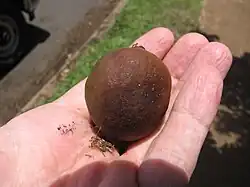Die kahlen, zur Reife gelblichen bis roten oder dunkelbraunen bis -violetten, einsamigen und nicht öffnenden, rundlichen bis ellipsoiden Früchte sind etwa 2,5–4,5 Zentimeter groß. Die Schale ist mehr oder weniger dick und das Mesokarp ist hart-fleischig. Der bis 2,5 Zentimeter große, ellipsoide Samen ist von einem gelb-weißlichen bis rosafarbenen, gelatinösen und leicht durchscheinenden Arillus umhüllt.
