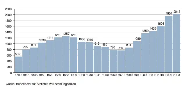 - ↑ a b Daten der Eidgenössischen Volkszählungen ab 1850 nach Gemeinden. (XLSX; 10 MB) Bundesamt für Statistik, Neuchâtel, 12. Juli 2024, abgerufen am 11. Mai 2025 (Öffnung in Excel nur über "Anhang/Excel-Datensatz" möglich).