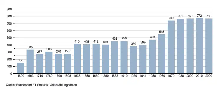 - ↑ Daten der Eidgenössischen Volkszählungen ab 1850 nach Gemeinden. (XLSX; 10 MB) Bundesamt für Statistik, Neuchâtel, 12. Juli 2024, abgerufen am 22. April 2025 (Öffnung in Excel nur über "Anhang/Excel-Datensatz" möglich).