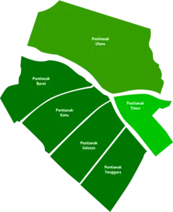 Pontianak gliedert sich in sechs Kecamatan (Distrikte), die sich wiederum in 29 Kelurahan (städtisch geprägte Dörfer oder Stadtteile) unterteilen. Die niedrigste (inoffizielle) Verwaltungseinheit sind 585 RW (Rukun Warga) und 2622 RT (Rukun Tetangga).