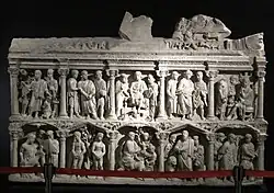 - Paradosis des Pilatus (griechisch, syrisch, armenisch und slavonisch), Weiterführung der Anaphora mit stark judenfeindlicher Tendenz: Wegen ihrer Schuld am Tod Jesu habe der Kaiser eine Verfolgung der Juden angeordnet.[65] Der Prozess gegen Pilatus findet demnach in einem heidnischen Tempel Roms und auf dem Kapitol statt. Der verurteilte Pilatus stirbt einen seligen Tod, unmittelbar danach auch seine Frau.[69]
