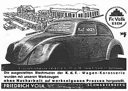 Der Umzug von Beierfeld in die neuen Hallen in Schwarzenberg erfolgte am 2. Oktober 1907. In der Firma arbeiteten inzwischen 30 Mitarbeiter. Ab dem 7. Mai 1908 nannte sich die Firma Erzgebirgische Schnittwerkzeug- und Maschinenfabrik GmbH Schwarzenberg, kurz ESEM. Die Gesellschafter waren Max Wutzler, Karl Goßweiler, Rudolf Häcker und Richard Stemmler. Im gleichen Jahr zog ESEM an den heutigen Standort in der Schwarzenberger Neustadt um, dort war genügend Platz für einen Neubau. Ebenfalls 1908 wurde eine Arbeitsordnung erlassen und ein Arbeiterausschuss gegründet sowie eine ESEM-Betriebsberufsschule eröffnet.[3] Seit dem 1. Januar 1904 nennt sich die Firma Erzgebirgische Schnitt-und Stanzenfabrik Wutzler & Goßweiler. Im Jahr 1906 hatte das Unternehmen, welches nun seit dem 1. April 1906 eine GmbH war. Aus dem Arbeiterausschuss entstand im Jahr 1921 der erste Betriebsrat. Im Jahr 1922 stellte die ESEM zum ersten Mal auf der Leipziger Messe ihre Erzeugnisse aus. Im Jahr 1927 begann mit einer vollautomatischen Kopierfräsmaschine die Modernisierung. Damit konnten dreidimensionale komplizierte Formen, von zum Beispiel Karosserieteilen, von einem Modell im Fühlerabtastverfahren hergestellt werden.[2] Somit begann die zuverlässige Fertigung von Karosserieteilen für die Autoindustrie. Es wurden weitere Maschinen angeschafft, wie eine Breitziehpresse, Senkrechtstoßmaschine, diverse Bohrwerke, Kurbelpresse und eine Tuschlerpresse. Fast alle deutschen Automobilhersteller, wie Audi, Opel, Horch, DKW, Steyer und Brennabor, MAN, Wanderer und Mercedes-Benz waren nun Kunden. Im Jahr 1934 zur Deutschen Automobilausstellung in Berlin nahm auch wiederum die ESEM mit ihren Erzeugnissen teil. Hier kam auch der erste Kontakt mit dem Fahrzeugkonstrukteur Ferdinand Porsche zustande. Der von Porsche entwickelte Volkswagen wurde nun in Schwarzenberg verwirklicht.[1] Im Jahr 1937 wurde Friedrich Volk aus Frankfurt am Main neuer Geschäftsführer und der neue Betriebsname lautet Friedrich Volk Erzgebirgische Schnittwerkzeug- und Maschinenfabrik/Schwarzenberg. Bereits ein Jahr später begann auch die Fertigung für den deutschen Automobilhersteller Volkswagen. Erstmals im Deutschen Automobilbau wurde aus einem Stück das Dach mit Heckfenster und Windlauf gezogen. Die Umformwerkzeugmaschinen entwickelten die Schwarzenberger Ingenieure unter Anleitung von Kurt Weigel.[3] Mit Ausbruchs des Zweiten Weltkrieges wurde die Produktion eingeschränkt und auch Rüstungsgüter (Torpedohülsen) hergestellt. Schließlich kam es im April 1945 infolge von Elektrizitätsmangels zum Zusammenbruch.[1][2][3]