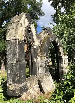 Die Platzierung der Gewände im Garten des Budenbergstifts diente als romantisches Element der Gartengestaltung.