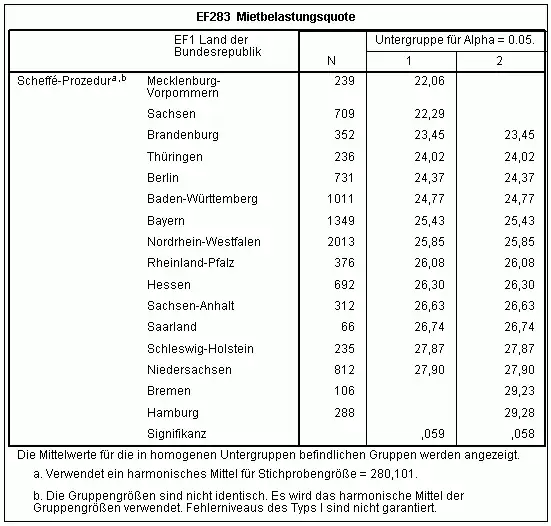 Für die Mietbelastungsquote (= Anteil der Bruttokaltmiete am Haushaltsnettoeinkommen), entnommen aus den CAMPUS Files für den Mikrozensus 2002 des Statistischen Bundesamtes, ergeben sowohl der nicht-parametrische Median-Test als auch die parametrische einfache Varianzanalyse (englisch one-way ANOVA) hochsignifikante Unterschiede in den Medianen bzw. Mittelwerten der Bundesländer. D. h., es gibt also Unterschiede zwischen den Bundesländern in den mittleren Mietausgaben (im Verhältnis zum Einkommen).