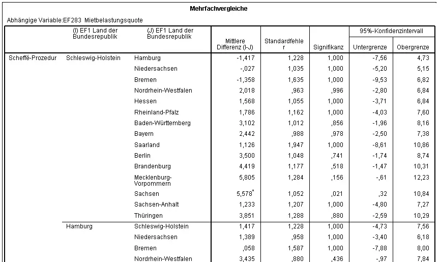 Der paarweise Vergleich dient der Aussage über signifikante Unterschiede zwischen den Mittelwerten der einzelnen Gruppen. Im vorliegenden Beispiel werden für die jeweiligen paarweisen Vergleiche für jede Kombination von zwei Bundesländern ausgegeben: