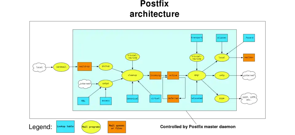 - Die blauen Kästen stehen für sogenannte Lookup tables (postfix maps). Sie enthalten in zwei Spalten Informationen, die zur Weiterverarbeitung von E-Mails herangezogen werden können. Dies kann eine Zugriffsliste (engl. access) sein, die darüber bestimmt, ob die E-Mail angenommen wird oder nicht, zum Umschreiben des Adressaten bzw. Senders oder auch der weitere Weg (engl. transport), den eine E-Mail nehmen soll.