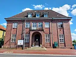 Das zweigeschossige traufständige verklinkerte Gebäude auf Sockel, mit ziegelgedecktem Walmdach und mit drei Giebelgauben, wurde 1933 nach Plänen von Regierungsbaumeister Friedrich August Wilhelm Schuckmann (Bremen) gebaut, aus Mitteln der Geschwister Ries. Die symmetrischen Fassaden wurden gestaltet durch einen mittigen rundbogigen Eingang mit dem von Pfeilern getragenem Vorbau, davor eine Freitreppe und eine spätere seitliche Rampe sowie darüber ein Balkon mit gusseiserner Brüstung. In Rotstein wurden das Gesimse und die Lisenen ausgeführt.[1] Die städtische Apotheke wurde später zum Verwaltungsgebäude der Gemeinde umgebaut.