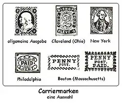 Zur Bezahlung der Briefbestellung diente eine Marke mit dem Bild des Präsidenten im Oval und der Inschrift „Carriers Mail“ in Orangebraun, ab 1851 in Blau auf Rosa. Von der orangebraunen Marke sind bis heute nur sehr wenige Exemplare bekannt; es gibt aber Neudrucke. Ebenfalls 1851 erschien eine Marke mit der Inschrift „U.S.P.O. Despatch“. Diese Marke zeigte einen aufsteigenden Adler. Für diese Marken war eine Wertangabe nicht erforderlich, die Zustellung kostete allgemein 1 Cent.[2]