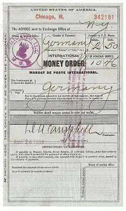 Im Amtsblatt der Deutschen-Reichs-Postverwaltung vom 7. September 1875 wird der Kurs für die Umrechnung der aus den USA kommenden Postanweisungen mit 3 RM = 71 Cent in Gold angegeben. Seit dem 1. April 1880 waren internationale Postanweisungen bis 50 Dollar zugelassen. Die Gebühr betrug mindestens 40 Pfg. der Umrechnungskurs: 100 Dollar entsprachen 424 RM.
