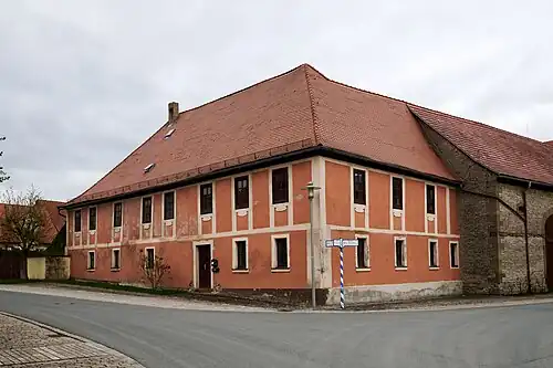 An das Hauptgebäude schließt sich eine Scheune an der Kirchstraße an. Sie präsentiert sich als Halbwalmdachhaus mit Eckquaderung. Das Gebäude blieb unverputzt, sodass die unbehauenen Bruchsteine sichtbar sind. Die Scheune entstand in der zweiten Hälfte des 19. Jahrhunderts. Zwei große Rundbogenportal verweisen auf die Nutzung als Posthalterei. Um die beiden Bauten gruppieren sich mehrere Kleindenkmäler, die eng mit der Geschichte der Posthalterei in Verbindung stehen. Zum einen haben sich zwei Steinbänke erhalten, zum anderen hat sich ein Wegweiser in den blau-weißen Farben des Königreichs Bayern erhalten. Ausgeschrieben sind die Wege nach Nürnberg, Würzburg und Ziegenbach.