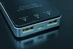 Eine Powerbank ist gewöhnlich mit einer oder mehreren Lithium-Ionen-Akkuzellen ausgerüstet, daher ist die Mitnahme im Flugzeug aufgrund der Brandgefahr an Bedingungen geknüpft.[1] Sie enthält einen Schaltregler zur Stabilisierung der Ausgangsspannung und Strombegrenzung sowie oft LEDs zur Anzeige des Betriebs- bzw. Ladezustands. Die Stromabgabe erfolgt über einen oder mehrere USB-Anschlüsse (Typ A oder C), geladen wird die Powerbank über einen Micro-USB (Typ B)-Anschluss, bei neueren Modellen über einen USB-C-Anschluss.[2] Die möglichen Lade- und Entladeströme sind nicht standardisiert und können von den USB-Spezifikationen abweichen.