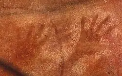 - Metaphysische Symbolik: Die weltweit in Höhlen zahlreich nachweisbaren seltenen positiven und sehr zahlreichen negativen Handabdrücke[36] sind nach Lewis-Williams als engstmögliche Kontaktaufnahme mit der Geisterwelt hinter den Höhlenwänden zu werten und damit wohl auch als einer der ältesten Nachweise für eine archetypische religiöse Metaphorik. Sie entstanden entweder durch Auftragen von Farbe auf die Handfläche, wobei er die Höhlenwand als diesseitig-jenseitige Membran verstanden; oder durch Blasen von Farbstaub auf die eng an die Felswand gepresste Hand, nach seiner Interpretation durch den Atem als wahrnehmbarste Essenz des Menschen, der sich dadurch in den Fels und seine Darstellungen hineinprojizierte und derart mit seinem jenseitigen Substrat eins wurde.[37] Sie gehören damit zu den ersten eindeutigen Zeichen des zum Homo religiosus sich wandelnden Homo symbolicus,[38] eine Entwicklung, die mit der Erfahrung des Heiligen das noch heute bestehende geistige Stadium des Homo sapiens sapiens markiert,[39] zumal alle Datierungen solcher Handnegative sie in die früheste Periode der frankokantabrischen Felsbilder verweisen und diese Darstellungen von späteren Bewohnern der Höhlen bereits ganz offensichtlich nicht mehr verstanden wurden, da sie sie als offenbar gefährlich empfundenen Zauber zerstörten oder übermalten.[40]