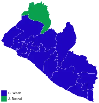 In die Stichwahl zogen George Weah der Congress for Democratic Change und Joseph Boakai der Unity Party ein. Zunächst war die zweite Runde der Wahl für den 7. November angesetzt.[1] Aufgrund der Klage des drittplatzierten Charles Brumskine der Liberty Party wurde eine Verschiebung des Wahltermins notwendig.[2] Der Supreme Court wies die Klage ab.[3]