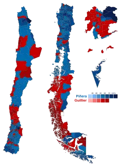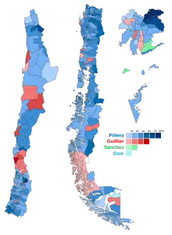 Im ersten Wahlgang am 19. November 2017 erreichte keiner der sieben Kandidaten die absolute Stimmenmehrheit, weswegen am 17. Dezember 2017 eine Stichwahl zwischen den beiden bestplatzierten Kandidaten Sebastián Piñera und Alejandro Guillier stattfand. Piñera siegte nach Auszählung fast aller Stimmen (54,6 Prozent). Sein Herausforderer Guillier (45,4 Prozent) räumte eine „schmerzhafte Niederlage“ ein.[1]