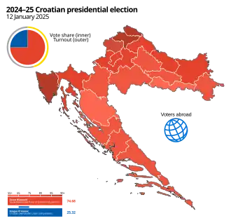 Da Amtsinhaber Zoran Milanović im ersten Wahlgang am 29. Dezember 2024 die absolute Mehrheit der Stimmen mit 49,1 Prozent knapp verfehlte, fand am 12. Januar 2025 ein zweiter Wahlgang zwischen ihm und dem zweitplatzierten Kandidaten Dragan Primorac statt.[1]