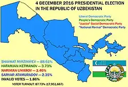 - ↑ IFES Election Guide | Elections: Uzbekistan Presidential Election 2016. Abgerufen am 9. Juni 2020.