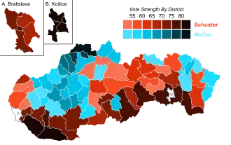 In der ersten Wahlrunde dominierten der Regierungskandidat Rudolf Schuster und der Oppositionsvertreter Vladimír Mečiar vor allen anderen Kandidaten. Keiner hat aber eine absolute Mehrheit erhalten, und damit wurde eine zweite Wahlrunde notwendig. Schuster siegte in Großstädten Bratislava und Košice, im gesamten Süden der Slowakei, um Banská Bystrica, in der Zips und Šariš; der ehemalige Ministerpräsident Mečiar hat im weiteren Waag- und Neutratal, teilweise in der Mittelslowakei und vereinzelt im Nordosten und äußersten Westen die Mehrheit erhalten.