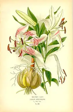 - Lilium speciosum var. album (Mast.) G.F.Wilson: Blüten weiß, zur Basis hin grünlich überlaufen.