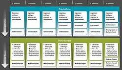 Der Ablauf eines praxisintegrierten Studiums ist, je nach Hochschule, unterschiedlich organisiert. Generell wechseln sich Theoriephasen, in denen Studierende die Hochschule besuchen, mit Praxisphasen, in denen die Studierenden im Unternehmen tätig sind, tage- oder wochenweise ab.[2] In der Regel dauert ein praxisintegriertes Studium 3–4 Jahre (6–8 Semester).[3]