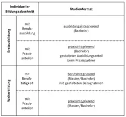 - ↑ Vgl.: Informationsseite über das Duale Studium http://www.duales-studium.de/allgemein/formen-des-dualen-studiums#b, aufgerufen am 22. Mai 2015.