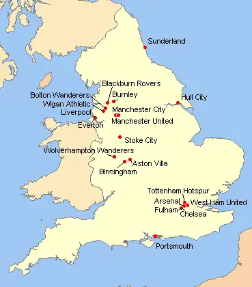 | 2009/10[2] | ARS | AST | BIR | BLA | BOL | BUR | CHE | EVE | FUL | HUL | LIV | MNC | MNU | POR | STK | SUN | TOT | WHU | WIG | WOL |