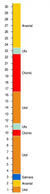 | Ural Jekaterinburg | 0:0 | 1:3 | 0:0 | 3:0 | 1:1 | 0:1 | 0:1 | 0:1 | 1:1 | 0:3 | 0:0 | • | 2:1 | 2:0 | 0:1 | 1:1 |