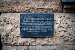 „In diesem Gebäude war von 1939 bis 1945 die geheime Staatspolizei (Gestapo) untergebracht. Es war ein Zentrum nationalsozialistischer Gewaltherrschaft, in dem zahlreiche Gegner des Regimes gefangengehalten und misshandelt wurden. Viele von ihnen wurden von hier aus in die Konzentrationslager verschleppt und fanden dort den Tod.“