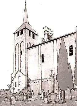 In den französischen Quellen (siehe Weblinks) gibt es eine ganze Reihe recht alter schwarzweißen Fotos, vermutlich aus der zweiten Hälfte des 19. Jahrhunderts. Die meisten zeigen die Kirche mit den hohen Attiken, und den darauf ruhenden Dachtraufen, wie sie heute noch zu sehen sind. Es gibt aber auch drei wahrscheinlich etwas ältere Fotos als die anderen, auf denen diese Attiken fehlen, und die Dachtraufen auf ihren ursprünglichen Traufgesimsen aufliegen! Man könnte daraus schließen, dass diese wehrtechnischen Ausrüstungen schon einmal entfernt gewesen sein müssen, aber gegen Ende des 19. Jahrhunderts im Rahmen von Restaurierungsarbeiten wiederhergestellt worden sind. Das gilt auch für die Brüstung des offenen Narthex des Westwerks.