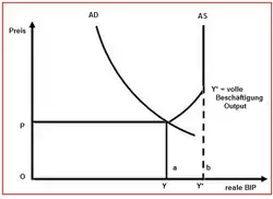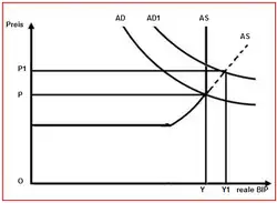 Eine positive Produktionslücke tritt dann ein, wenn die tatsächliche Produktion einer Wirtschaft höher ist als ihre potenzielle Produktion. Dies erscheint unmöglich und tatsächlich kann eine Wirtschaft langfristig nicht mehr produzieren als die produktiven Kapazitäten erlauben. Für eine kurze Weile jedoch ist es möglich, dann nämlich, wenn die Arbeiter Überstunden machen, einige Arbeiter, die normalerweise nicht im Arbeitsprozess stehen, diese betreten und die Maschinen maximal genutzt werden. Langfristig ist dieser Zustand aber nicht haltbar, es sei denn, das AS (Aggregate Supply) erhöht sich. Die obige Grafik zeigt die positive Produktionslücke und eine Zunahme des AD (Aggregate Demand), der eine Erhöhung des AS bewirkt, die über dem potenziellen Output und der Preissteigerung von P zu P1 liegt. Tatsächlich erleben Länder mit positiven Output Gaps oftmals eine starke Inflation.
