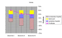 Wären die Preise gleich den Werten, dann wären auch die Profite gleich den Mehrwerten und in der Branche I würde die größte Profitrate (Verhältnis Mehrwert zum eingesetzten Kapital, das sich aus variablem und konstantem Kapital zusammensetzt), in der Branche III die niedrigste Profitrate anfallen.