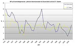 Die 1. Abbildung zeigt den Produktivitätszuwachs von Deutschland und USA gemessen in BIP je Erwerbstätigenstunde. Deutschlands Produktivitätszuwachs um fünf Prozent im Jahre 1991 kann dabei als eine Folge der Wiedervereinigung interpretiert werden.