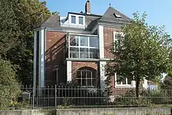 Der zweigeschossige Walmdachbau aus unverputztem Backstein mit Eckrustizierung und Balkon wird von einer schmiedeeisernen Garteneinfriedung der Erbauungszeit umgeben.