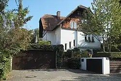 Der zweigeschossige Putzbau mit Schopfwalmdach und Wiederkehr (Anbauten an Fassade oder Dach von Gebäuden) hat einen Flacherker, Zierfachwerk und einen verschindelten Giebel. Der historisierende Bau besitzt Anklänge des Jugendstils.