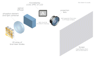 Alternativ können auch Projektoren mit einem phosphorisierenden Leuchtstoff eingesetzt werden, der mit einem (meist blauen) Laser angeregt wird und der als annähernd punktförmige Weißlichtquelle im Beleuchtungsstrahlengang einer herkömmlichen optischen Abbildung eines Bildgebers dient.