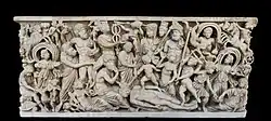 In der kaiserzeitlichen römischen Sarkophagplastik war der Mythos ein geschätztes Thema, wobei die Erschaffung des Menschen im Vordergrund stand. Ein um 220 geschaffener Prometheussarkophag stellt die einzelnen Szenen des Ablaufs der Sagenhandlung dar.[66] Auf einem Sarkophagfragment aus dem 3. Jahrhundert erweckt Prometheus eine Menschenfigur zum Leben, indem er sie mit ausgestrecktem Mittel- und Zeigefinger berührt; diese Art der Beseelung wurde in einer Reliefdarstellung des biblischen Menschenschöpfungsakts auf einem christlichen Sarkophag der beginnenden Spätantike übernommen. Auch sonst zeigen sich ikonographische Übereinstimmungen zwischen den Prometheussarkophagen und einer Gruppe von christlichen Sarkophagen des 4. Jahrhunderts.[67]