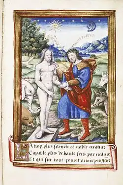 In der Frührenaissance zeigten die italienischen Humanisten ab etwa der Mitte des 14. Jahrhunderts Interesse an dem Stoff. Francesco Petrarca (1304–1374) kannte eine Version des Mythos, in der Prometheus nicht von einem Adler, sondern von einem Geier gequält wird; es handelt sich um eine Variante, die schon in der römischen Kaiserzeit bezeugt ist und in der Neuzeit öfters rezipiert wurde. Petrarca meinte, die Legende habe einen historischen Kern, der darin bestehe, dass Prometheus die Einsamkeit des Kaukasus aufgesucht habe, um in unermüdlichem Forscherdrang die Rätsel der Welt zu lösen. Der fressende Vogel symbolisiere die Anstrengung des Forschers, die ihn schwäche.[70] Dieser Ansicht war auch Petrarcas Freund Giovanni Boccaccio (1313–1375), der in seiner Schrift Genealogia deorum gentilium eine ausführliche Beschreibung und neuartige Auslegung des Mythos vorlegte. Boccaccio nahm einen „zweifachen“ Prometheus an, da in der mythischen Überlieferung zwei verschiedene Personen vermengt seien. Der erste Prometheus sei Gott als Schöpfer des „natürlichen“ Menschen. Er habe seinem Geschöpf Leben und den Verstand eingehaucht, aber ihm keine Bildung vermittelt. Daher sei der natürliche Mensch unwissend gewesen und habe wie ein Tier gelebt. Der Urheber der Zivilisation sei der zweite Prometheus gewesen, ein weiser Mann, der beschlossen habe, die Barbarei der Menschheit zu beenden. Unter dem Feuer sei die Klarheit des Wissens zu verstehen, das dieser Kulturbringer von Gott bezogen und den Menschen gebracht habe. Mit der Begründung der Zivilisation habe er den Menschen gleichsam neu erschaffen. Der zweite Prometheus sei in Wirklichkeit nicht nach der Beschaffung des „Feuers“ zur Strafe im Kaukasus angekettet worden, sondern habe sich vor seiner Großtat freiwillig dort aufgehalten, um einsam Studien zu treiben. Mit dem quälenden Adler seien die anstrengenden Gedanken gemeint, mit denen er sich dort geplagt habe.[71] Boccaccios durchweg positives Bild des vermenschlichten Kulturhelden Prometheus erweist ihn als Vorläufer späterer Renaissance-Humanisten wie Giovanni Pico della Mirandola, die den Geist des weisen, kreativen und insofern gleichsam göttlichen Menschen verherrlichten. Ähnlich dachte der Schriftsteller Filippo Villani, ein jüngerer Zeitgenosse Boccaccios. Er sah in Prometheus das Sinnbild des bedeutenden Künstlers. Die bildende Kunst ahme die Natur nach und sei somit eine Nachschöpfung nach dem Vorbild von Gottes Werk. Dieser Gedanke liege der antiken Legende vom erschaffenden Prometheus zugrunde.[72]