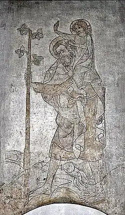 Über der Wilgefortisfigur wurde 1952 bei Renovierungsarbeiten ein Fresko mit der Darstellung des Christophorus aus dem 14. Jahrhundert freigelegt. Sie ist 3,36 Meter hoch und 1,19 Meter breit.[23] 1970 wurden bei Renovierungsarbeiten in der Nische des südlichen Querschiffes Malereien aus dem Katharinen-Martyrium entdeckt, freigelegt und in die Marienkirche übertragen, um Raum für die neue Orgel zu schaffen.[19] Am Langhausvierungsbogen wurden mittelalterliche Malereien gefunden; ein mittelalterliches Fragment wurde am Turmbogen des Langhauses freigelegt. Die Darstellung eines Zimmermannes bei der Arbeit (möglicherweise Josef) befindet sich am Turmbogen.[24]