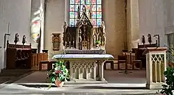 Der neugotische Hochaltar aus Sandstein löste 1880 den barocken ab. Der Aufsatz besteht aus mehreren Türmchen und Figuren. In der Mittelnische steht ein gotisches Kruzifix aus dem 14. Jahrhundert. Das Sepulcrum enthält Reliquien der Heiligen Fulgens und Basilissa. Der stählerne Tabernakel hat bronzene Türen, die mit emaillierten Engelssymbolen verziert sind. Bei der Renovierung 1969/1970 fertigte die Firma Koch aus Geseke den Volksaltar aus vorhandenen neugotischen Teilen, passend zum Hochaltar. Er ist 97 Zentimeter hoch, 190 Zentimeter breit und 89 Zentimeter tief. Der Ambo aus Sandstein, ebenfalls von Koch aus Geseke, hat als Auflage eine Platte aus Eichenholz.