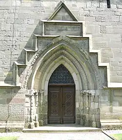 Das Turmportal in der Westwand ist in tief gestaffelten Spitzbogen-Gewänden reich gegliedert. Darüber befindet sich eine treppenartige Verdachung mit einem Dreiecksgiebel und Rosetten. Unter dem Giebel ist eine kleine Konsole, vermutlich für eine Freifigur, angebracht. Über dem Portal ist eine achtseitige blinde Fensterrose eingelassen. Das Nordportal mit Kleeblattbogen unter einer Rundbogenarchivolte ist dem Marktplatz zugewandt. Die Säulchen in der abgetreppten Laibung setzen sich im Rundbogen als Wülste mit profilierten Schaftringen fort. Die tiefgekehlte Außenkante des Bogens ist mit Männchen und Blattknospen verziert. Das einfache rundbogige Südportal ist in der Laibung zweimal abgetreppt. Darüber befinden sich zwei rundbogige Fenster. Ein weiterer Eingang in der Nähe der kleinen Tür im Westjoch wurde 1730 zugemauert.[12]