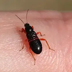 Die Wanzen werden 7,5 bis 10,0 Millimeter lang.[1] Der Halsschild ist schwarz gefärbt und trägt häufig einen blauen bis grünlichen metallischen Schimmer. Die Hemielytren und die Beine sind rot. Die Schenkel (Femora) der vorderen Beine sind kurz und dick. Die Stinkdrüsen liegen am Rücken des Hinterleibs. Es treten sowohl lang-, als auch kurzflügelige Individuen auf.[2]
