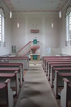 Bei der letzten umfassenden Inneninstandsetzung wurde die Kirche neu gestaltet. Der Kircheninnenraum erscheint mit seinen Architektur- und Ausstattungselementein in neuem Farbkonzept. Die Kirche erhielt einen neuen Boden mit Natursteinplatten und einen nach individuellen Entwürfen gefertigten Blockaltar in Sandstein und ein Taufbecken mit Rundstele und vergoldeter Schale. Bei der Wandgestaltung wurde auf das häufig anzutreffende farbige Absetzen der Fensterleibungen mittels Faschen verzichtet. Aufgesetzte Elemente aus Stahlprofilen in Rundrohr, welche die Fenstergliederung stilisiert aufnehmen, strukturieren stattdessen die Kircheninnenwände dezent in der Fläche und auch räumlich durch Licht- und Schattenwurf. An der Nordwand über der Empore wurde eine Spolie aus der ersten nachmittelalterlichen Kirche Menzweilers verbaut. Sie trägt die Inschrift: ANNO 1582 HABEN/GEMEINE HERSCHAFT STOLTZ/ENBERG DIESE KIRCH LAS/SEN BAVVEN MENTZWEILER/IM APRIL. Die Orgel mit rankenverziertem Prospekt wurde 1869 von Carl Wagner jun., Kaiserslautern, angefertigt.[2] In der Kirche befindet sich auch ein Kriegerdenkmal.