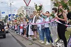 Am 21. August bildeten Demonstranten eine etwa zehn Kilometer lange[73] Menschenkette vor dem Gefängnis Okrestino, in welches zuvor viele der festgenommenen Demonstrierenden gebracht und brutal misshandelt worden waren; die Menschenkette erstreckte sich quer durch die die Hauptstadt Minsk bis zum Mahnmal für die Opfer des Stalinismus.[74]
