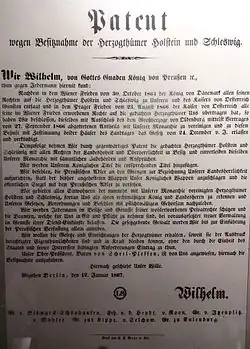 Der Deutsche Bund forderte die Rücknahme der Novemberverfassung und verhängte im Dezember 1863 eine Bundesexekution gegen das Herzogtum Holstein, welches von lauenburg-sächsischen und hannoverschen Bundestruppen besetzt wurde. Am 16. Januar 1864 stellten dann Preußen und Österreich Dänemark ein 48-Stunden-Ultimatum zur Aufhebung der Novemberverfassung und der Räumung Schleswigs, das Dänemark verstreichen ließ. Am 1. Februar 1864 überschritten österreichische und preußische Truppen schließlich trotz Kritik des Deutschen Bundes die Eider, den historischen Grenzfluss zwischen Holstein und Schleswig, und besetzten innerhalb weniger Monate das Herzogtum Schleswig und Teile des übrigen Jütlandes.[5] Am Ende des Krieges musste die dänische Monarchie auf alle drei Herzogtümer verzichten: Dänemark übertrug die Souveränität an Österreich und Preußen gemeinsam, ab 1865 verwaltete Preußen Schleswig und Österreich Holstein.